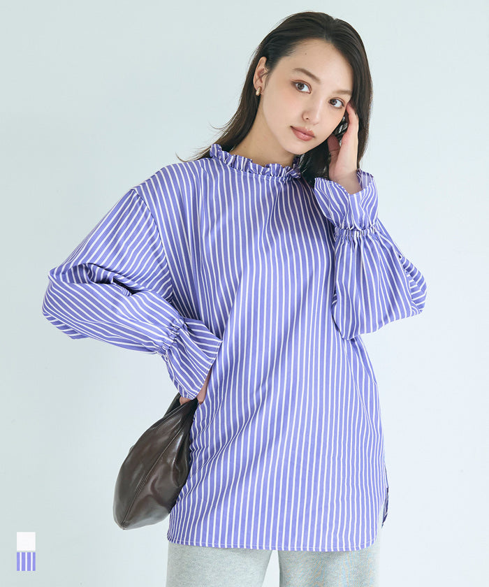 上品的立領飾有優雅的荷葉邊,營造出華麗的面部輪廓的長袖襯衫。 採用柔軟且具有下垂感的材質,打造出不會過分蓬鬆的輪廓。 具有適度的挺度和柔軟度,是日常穿著方便的萬能材料。 |